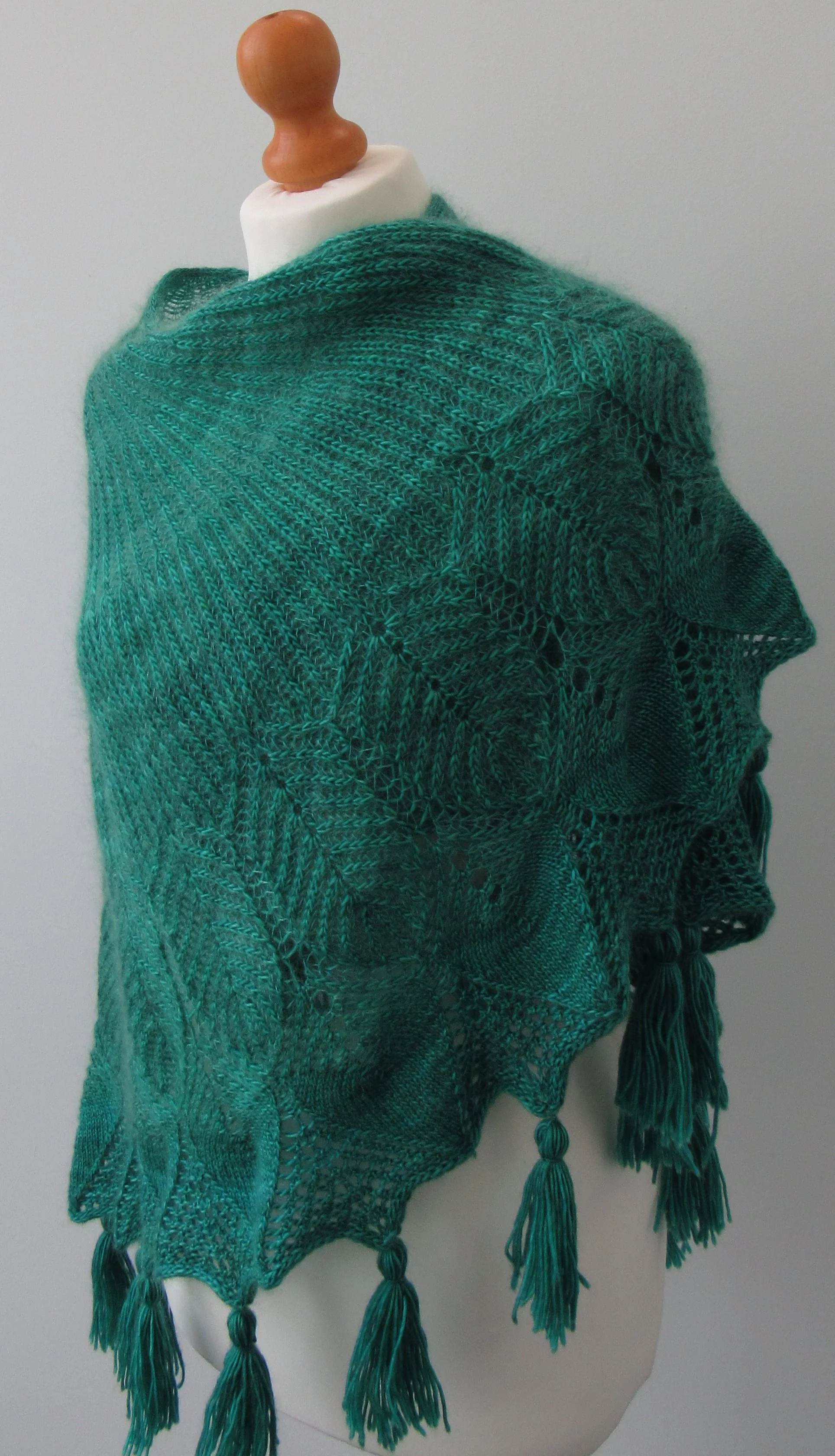 The pattern was originally designed to utilise coordinating yarns in two different weights (fingering and lace), with the original sample worked in the same colourway over two different yarn bases. However, if desired the pattern can be worked in a one or two fingering weight colourways. Please note that yarn usage and the finished size of the shawl may vary.